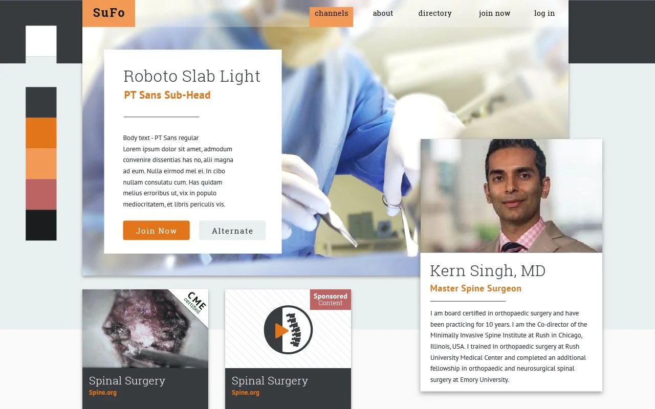 In discussing the visual presentation of SuFo the primary direction we I got from the client feedback was that they wanted to avoid the sterile look of the traditional medical site. They wanted to maintain the professional look that would separate them from general use video sites. However, they wanted to inject a bit of playfulness into the designs as well. While SuFo was a new product, the scope of this project was exclusively to create website artifacts and did not include branding.